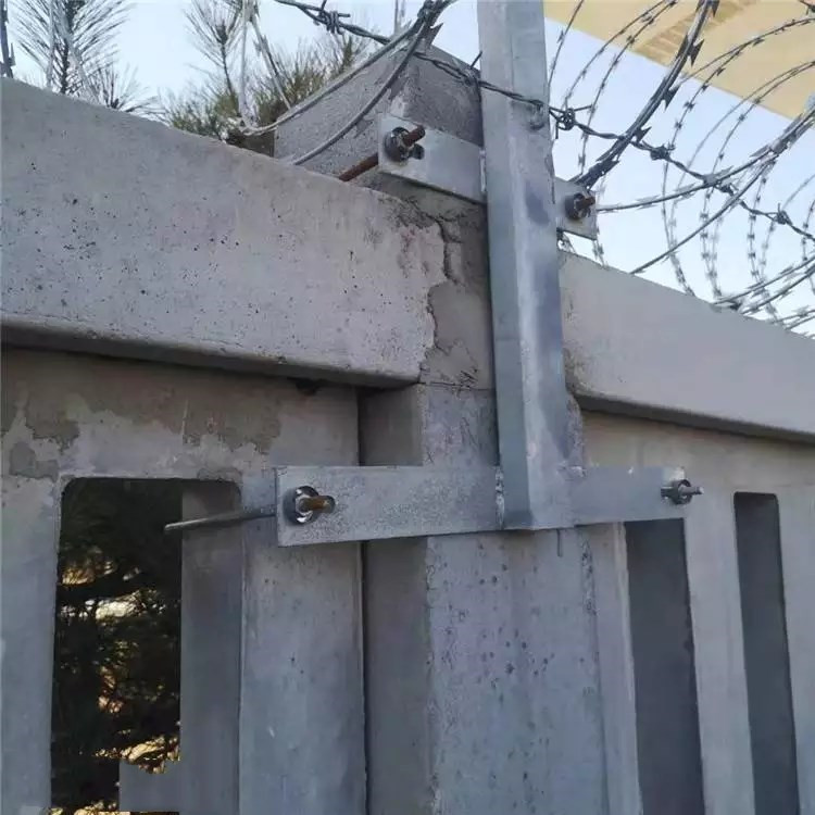 刺絲滾籠與支架連接:刺絲滾籠由刺絲連接卡扣與固定在支架上的縱向拉筋相連接。縱向拉筋與支架的連接采用Φ2.5mm的冷拔鍍鋅鋼絲繞2圈后擰緊固定。支架設(shè)置在跨度3m防護(hù)柵欄的立柱和跨中位置,其中跨度進(jìn)設(shè)置與立柱上部, 支架與防護(hù)柵欄采用支架抱箍連接,對于已經(jīng)安裝金屬網(wǎng)片的防護(hù)柵欄。刺絲滾籠直接采用Φ2.5mm的冷拔鍍鋅鋼絲或刺絲連接卡扣固定于金屬網(wǎng)橫片和金屬絲上。
