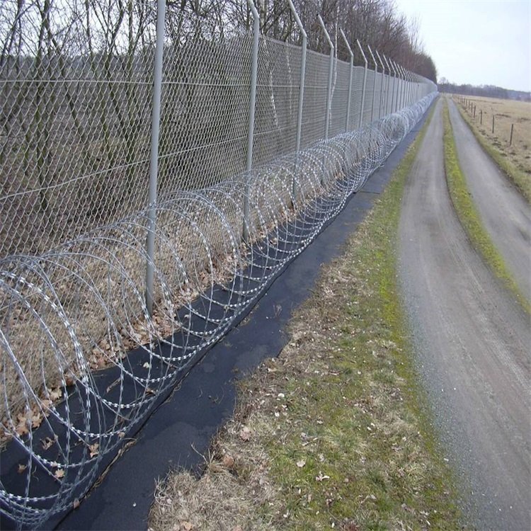 3、鍍鋅刺刀圈材料及安裝技術(shù)要求:鍍鋅刺刀圈材料:常用刀片刺網(wǎng)規(guī)格為BTO-22,刺圈直徑500mm,刀片長度22mm,刀片寬度15mm,刀片間距34mm,鍍鋅噴塑。鍍鋅刺刀圈規(guī)格為雙股2mm鐵絲捻扎而成,刺結(jié)間距102mm,鍍鋅防腐。鍍鋅刺刀圈安裝應(yīng)控制在每米圍界范圍內(nèi)有5個刺圈,即刺圈安裝間距20Omm,要求刀刺圈間距均勻,上下口平直。刺刀圈固定件為專用卡扣,使用專用工具固定在鋼圍界刺繩上,卡扣不得有松動現(xiàn)象,保證刺網(wǎng)安裝牢固。